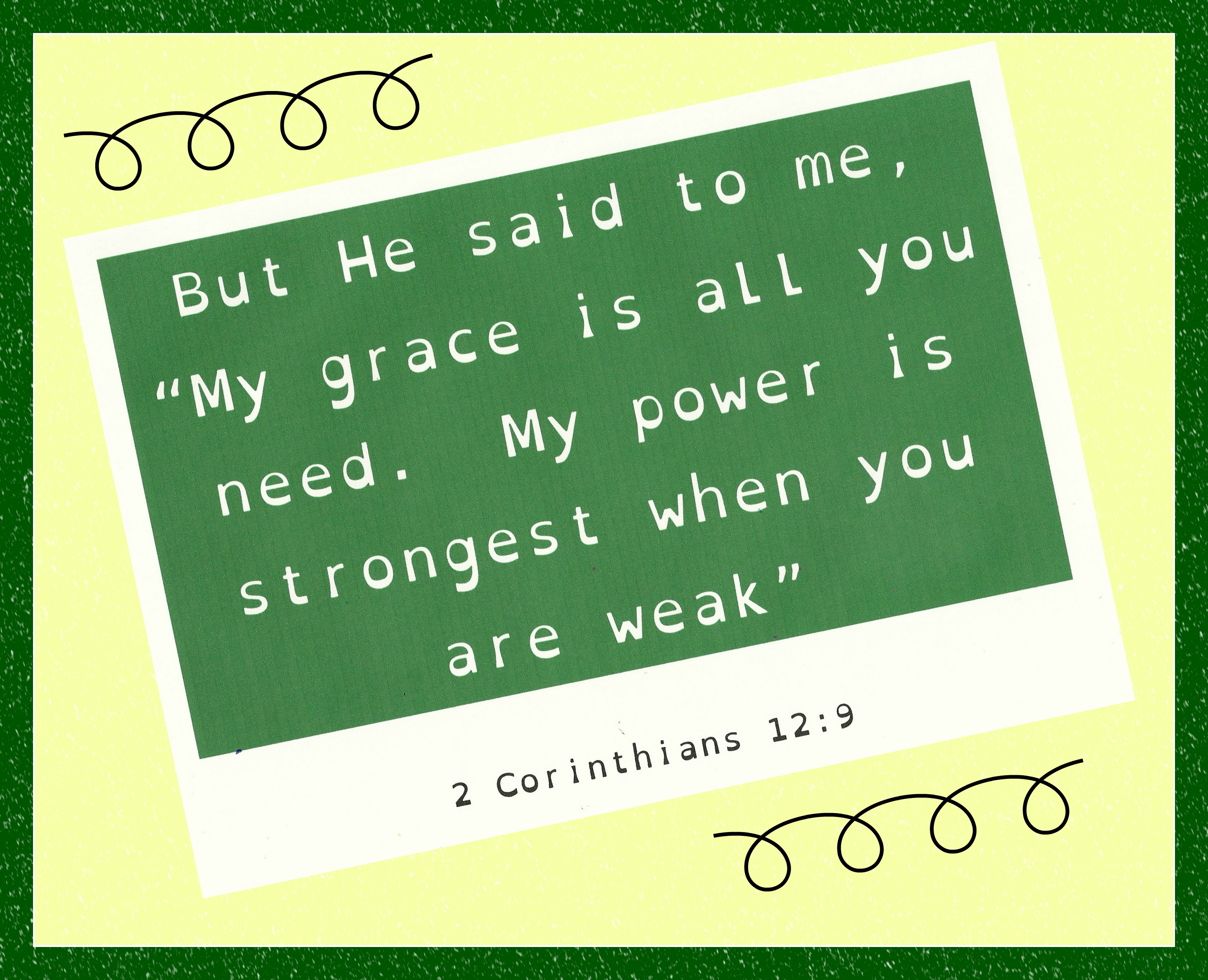 2 Corinthians 12:91.  2 Corinthians 12:9.  Paul wrote this verse after talking about how he had something he struggled with greatly.  He had asked Jesus to take this struggle away from him three separate times, but each time Jesus said, “No”.  Jesus wanted Paul to learn that His strength was enough.  It is when we are weak that God’s power is able to shine!  Does your child wish the dyslexia would be taken away?   Remind your child that God’s strength can SHINE in his life through his dyslexia!!