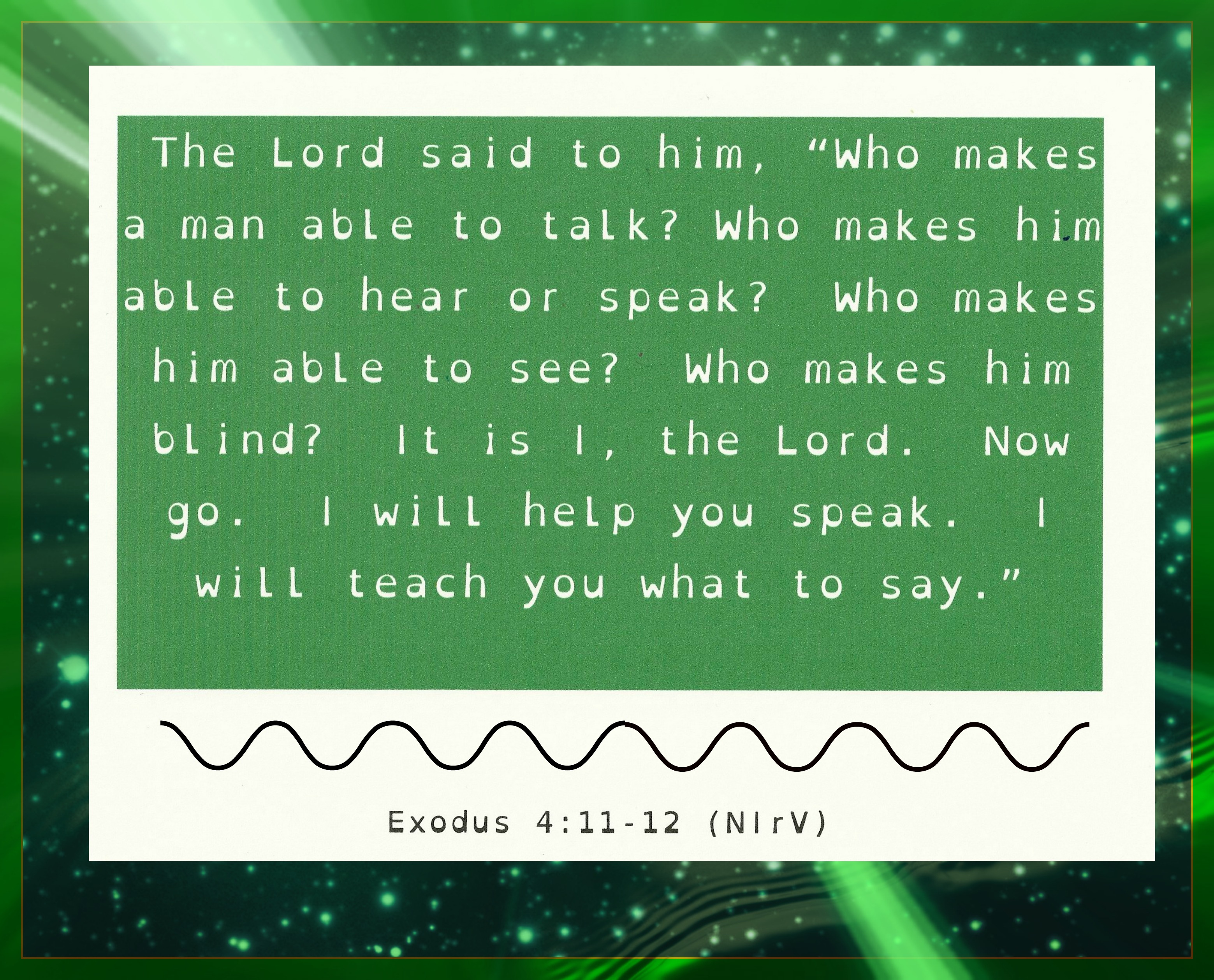 Exodus10.  Exodus 4:11-12.  I love these verses!  Moses is arguing with God, telling Him that there is no way he can carry out such a huge task as leading God’s people out of the promised land.  He keeps giving excuse after excuse after excuse.  These verses are part of God’s reply.  Does your child ever use his dyslexia as an excuse?  Remind him that God is the Lord — God will help him and will show him what to do.  Dyslexia does not excuse anyone from God’s service!!!!