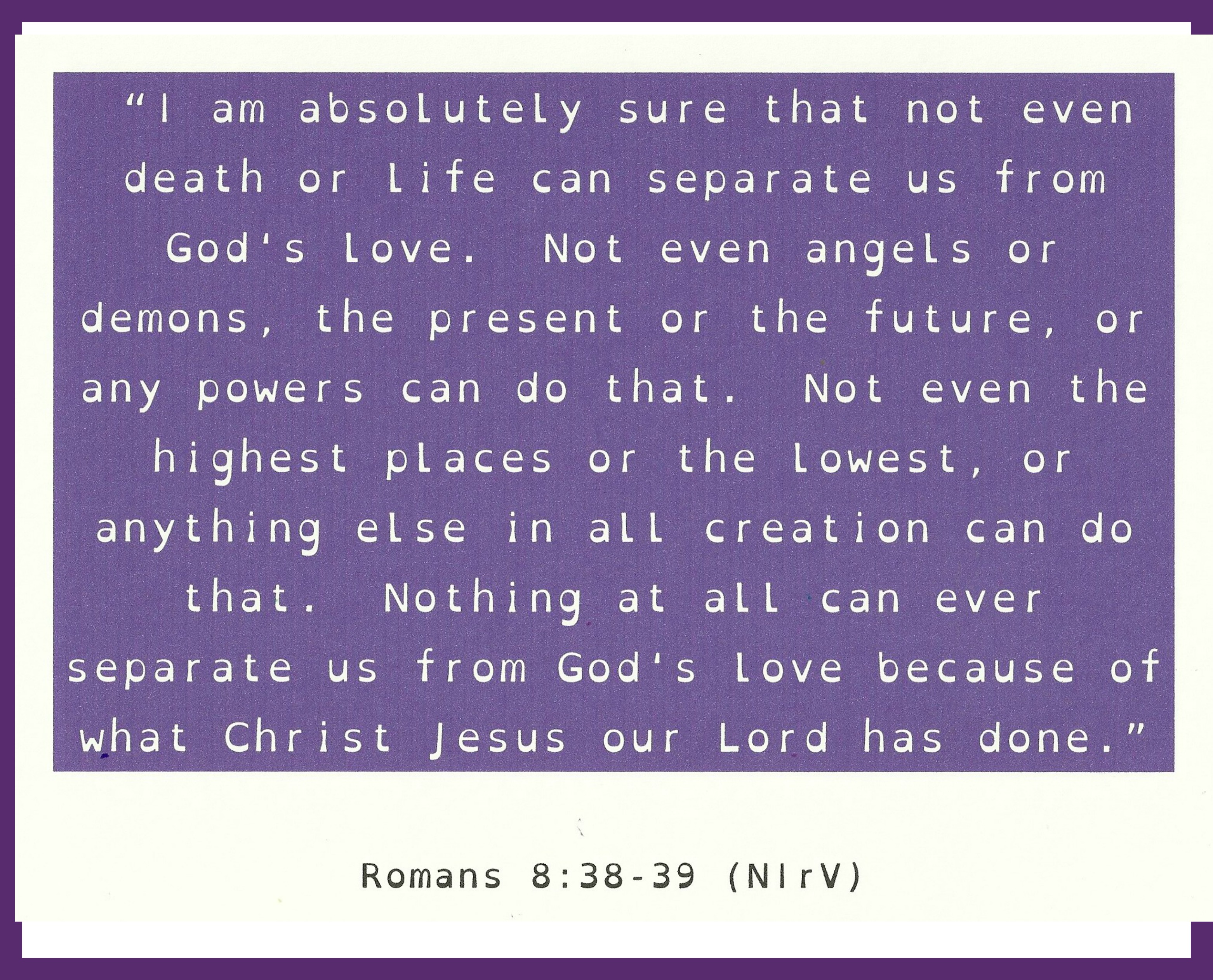 Romans 8:375.  Romans 8:38-39.  Nothing can separate us from the love of God.  Not dyslexia, not ADHD, not anxiety . . . nothing means NOTHING!!!   God’s love will always be surrounding us, helping us make it through the difficult times!