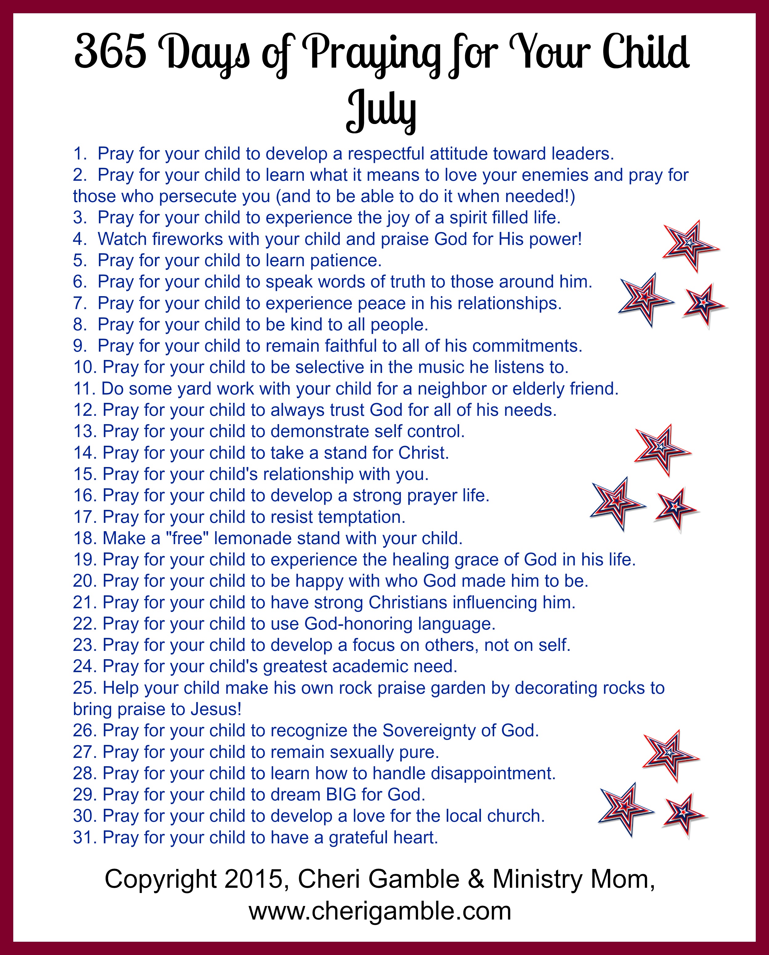 Please print off this month’s calendar and then spend time each day praying for your children. And while you’re at it, join our facebook group, “Raising Godly Kids” and come “like” my facebook page so you never miss anything that is happening here at Ministry Mom.