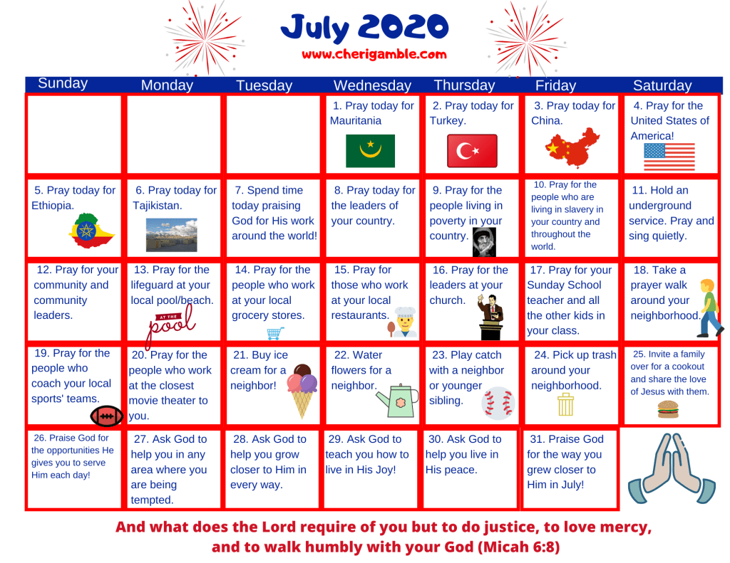 Welcome to the prayer calendar for July! Please use this calendar to help your children pray specific, big prayers this month.
