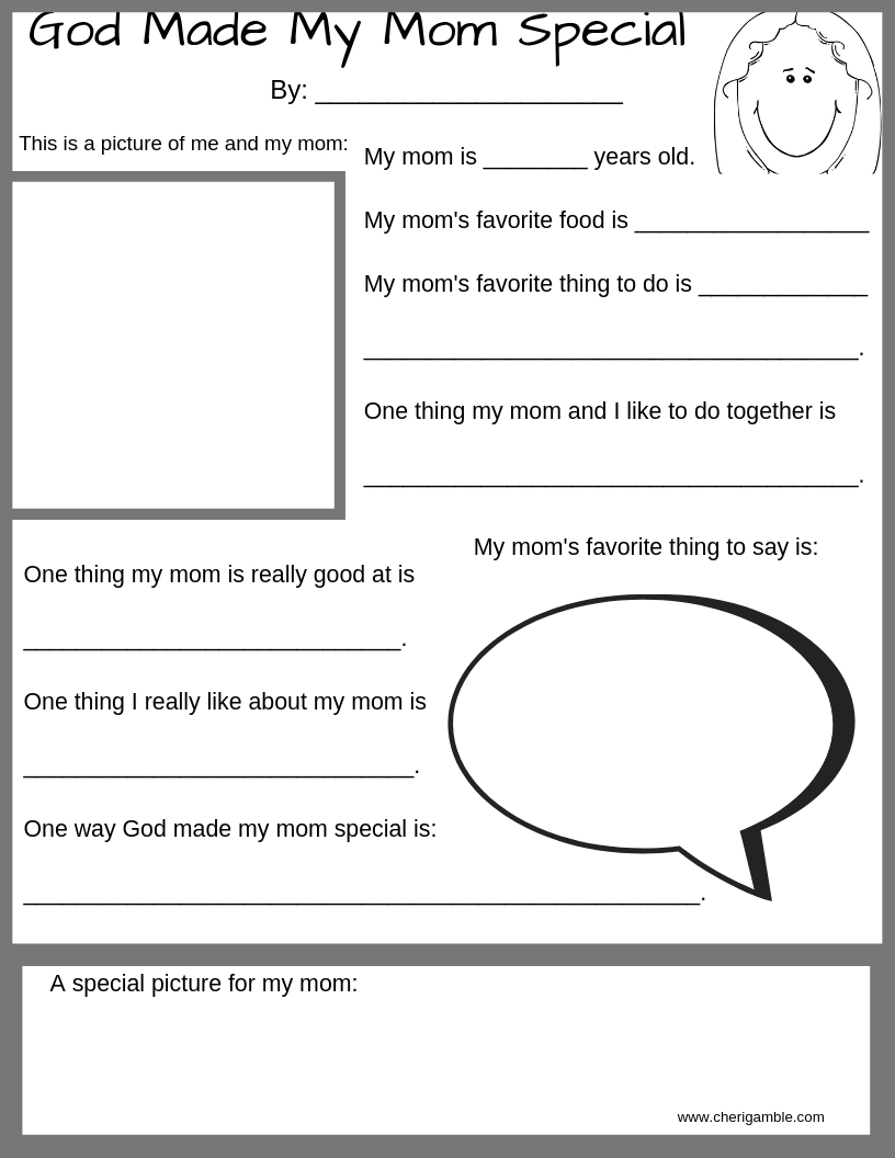 Happy Mother’s Day! This post contains two printables that you can use to help the kids in your life celebrate their moms! There is a printable for young children as well as one for older kids, so choose your favorite, print it off, and let your kids share how God made their moms special!