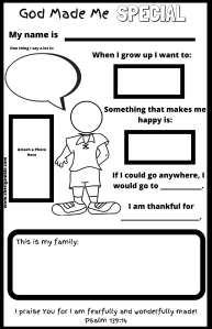 I’ve got a couple more “God Made Me Special” Printables for you to use with your children. This time I have them available in two sizes — a poster sized (11 x 17) and regular letter size (8 1/2 x 11). Make sure you select the correct paper setting on your computer when you go to print them off!