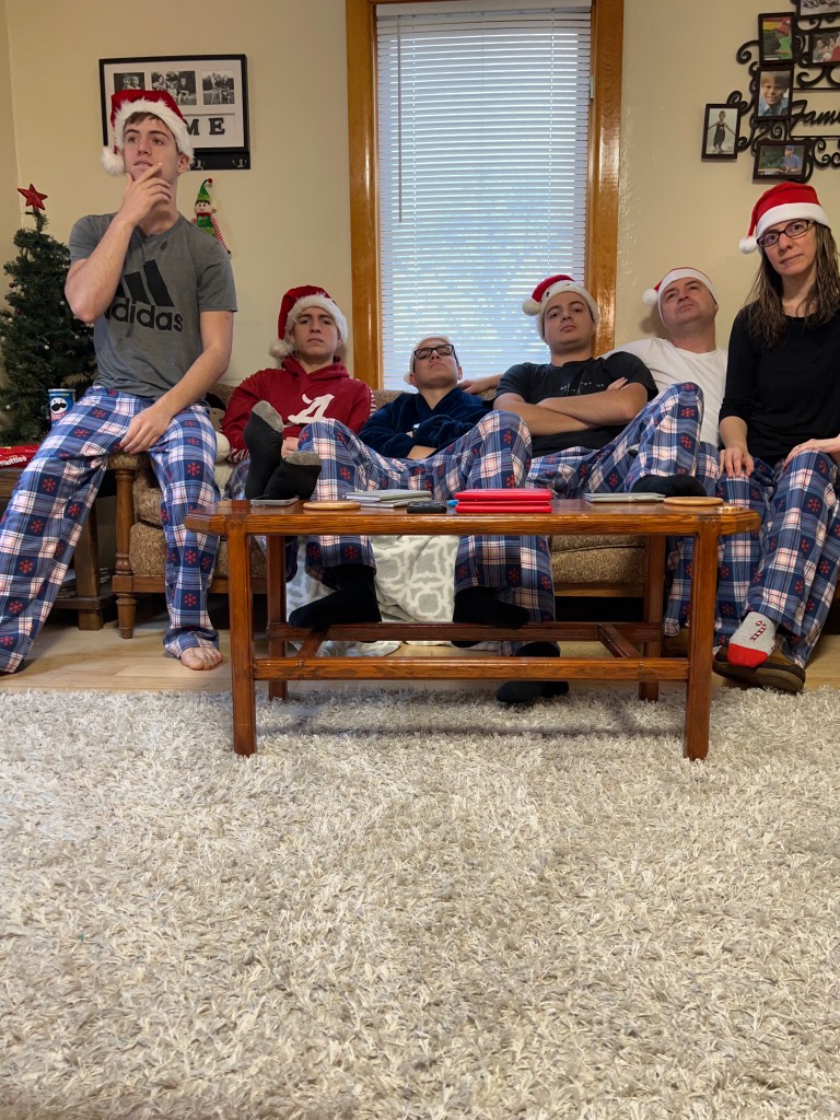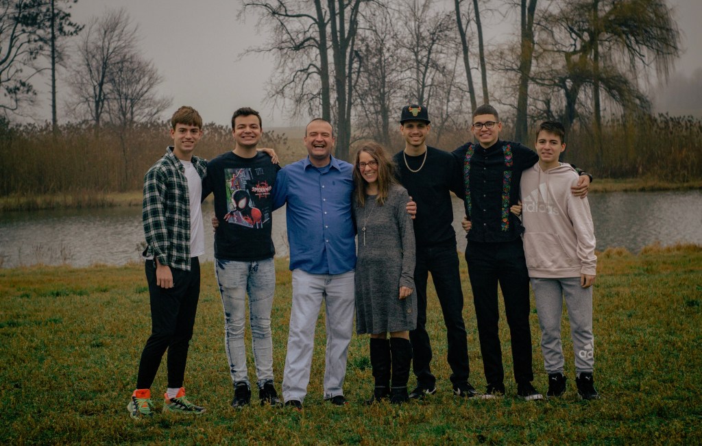 My husband and I have five sons (23, 21, 19, 17, & 14), one daughter-in-law, and one grandson. Whoa!